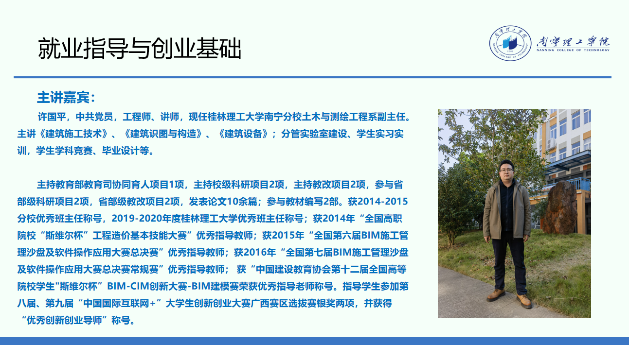 为进一步推动家校合作,加深家校联系,丰富教学方式,提升学生创新创业能力。我院于2023年12月27日19:30在1204教室举办了“鲲鹏计划”线上家长讲座。讲座主讲人是桂林理工大学南宁分校土木与测绘工程系副主任许国平老师。本次“鲲鹏计划”讲座由雷鸣老师带领我院2021级和2022级接近90名学生参与。