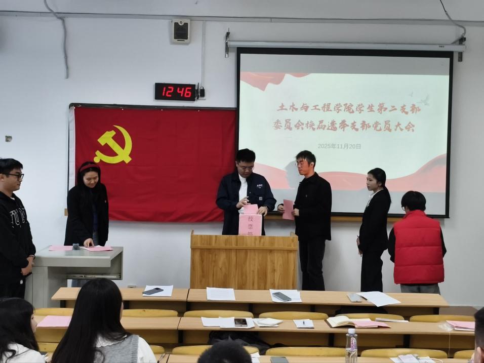陈素任同志代表新一届学生第二党支部班子作表态发言。他表示,未来一年将重点推进三项工作:一是深化理论知识,强化党员知识和意识;二是深化党建与教学科研、人才培养、社会服务的融合创新;三是发挥青年党员优势,在学科竞赛、创新创业、志愿服务等领域勇挑重担,引领广大同学成长成才。此次换届选举大会的成功召开,为学生第二党支部注入了新鲜血液,凝聚了组织力量,明确了发展方向。相信在新一届支部委员会的带领下,全体党员将以更加饱满的热情、更加务实的作风,踔厉奋发、勇毅前行,为推动学院党建工作再上新台阶、培养更多德才兼备的高素质土木专业人才书写崭新篇章。