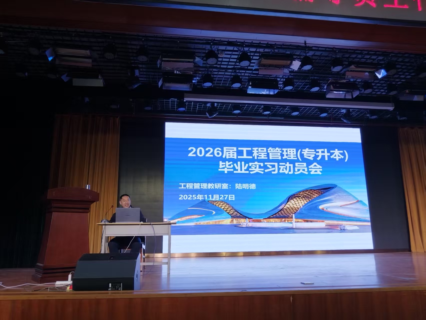 为切实落实实践教学核心目标,帮助毕业生厘清实习与毕业设计的核心任务,搭建校园理论与职场实践的衔接桥梁,11月27 日,工程管理教研室在 1 教报告厅正式召开 2026 届工程管理专业毕业实习与毕业设计动员会。教研室全体指导教师、辅导员及 2026 届工程管理专业全体毕业生齐聚现场,会议由教研室陆明德老师主持。