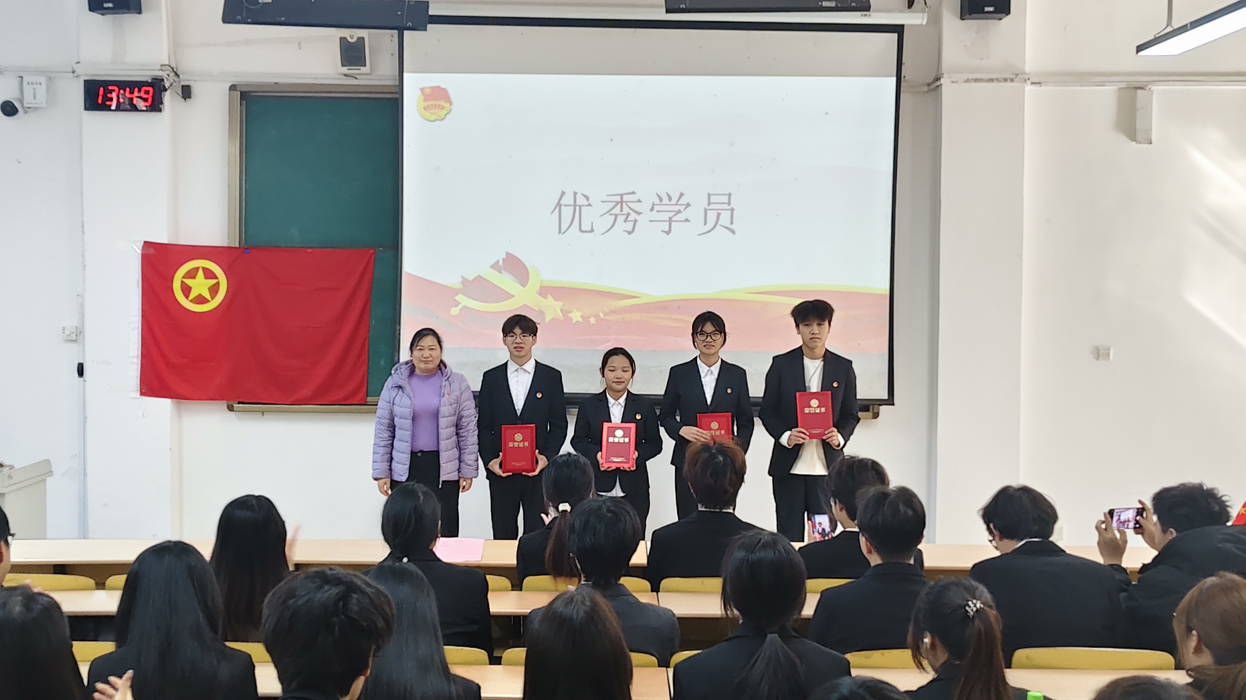 当主持人宣读优秀学员获奖名单时,现场气氛达到高潮。这份荣誉凝聚着获奖学员在理论学习、实践调研中的不懈努力。徐远菁老师为优秀学员代表颁发证书与奖章,奖杯与证书的光芒,成为学员们青春奋斗的最好见证。