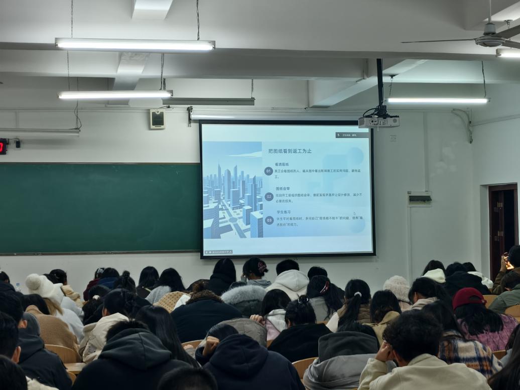 黄老师对目前的行业进行了分析,建筑行业变化迅速,绿色建筑、智能建造、装配式建筑不断涌现,除了课本知识,同学们应该学会通过一些线上渠道了解最新的政策和技术动态,做到快速捕捉趋势。专业系统也应不断练习,提高自身竞争力,增强制图技能。进入社会实习实践后,校友、同事、参与讲座时有机会见到的行业人士,都可以作为不断扩展的人脉资源。建筑行业有多种岗位,如施工员、造价师、设计师、项目经理等,每个岗位都有其核心性格和技能要求,也有不同的目标设定。要提前做好长短期目标的规划,逐步实施,稳定推进。