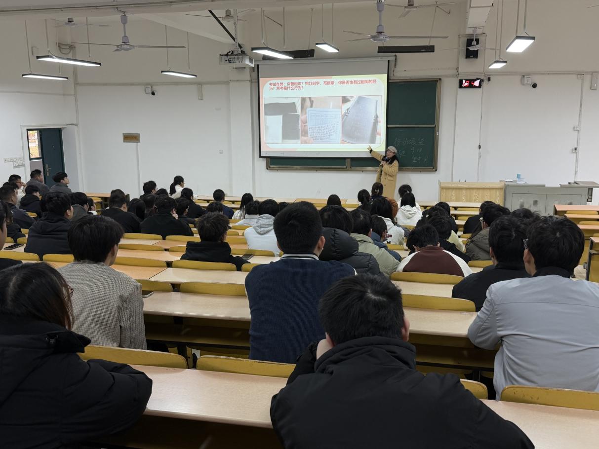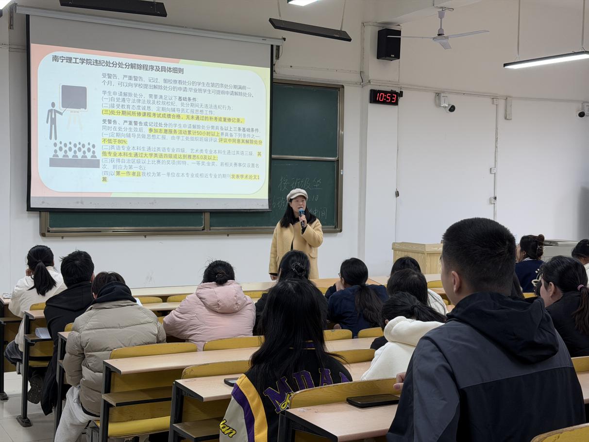 辅导员王美雪先明确各项考前工作以及讲解明确考试全流程纪律要求,确保每位同学清楚。为让纪律要求更具警示意义,辅导员分享了作弊被抓典型案例,并展示了对应的处分公文,进一步解读了“处分解除”的具体政策。