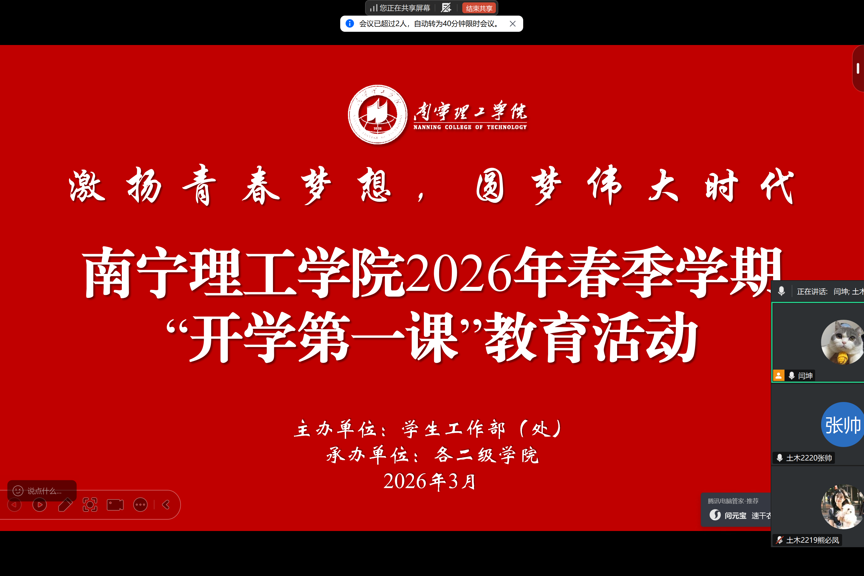 为引导学生坚定理想信念、筑牢安全防线、涵养优良学风,近日,土木与工程学院组织开展2026年春季学期“开学第一课”教育活动。本次教育活动围绕思想政治教育、网络安全、学风建设、卫生健康四大板块,结合各年级学生特点和成长需求分层施教,助力学生在新学期开好头、起好步。