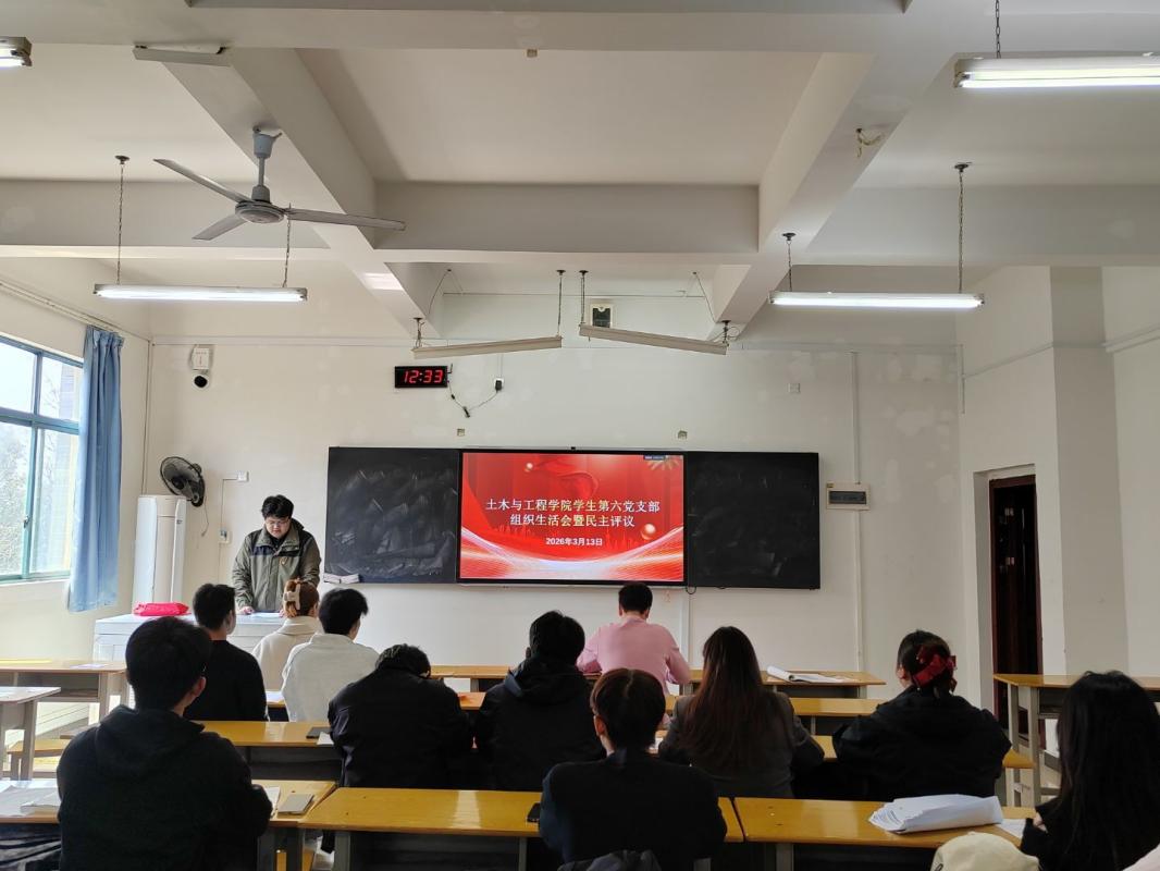 为深入学习贯彻党的最新理论成果,巩固拓展党纪学习教育成效,进一步提升支部凝聚力与战斗力,2026年3月13日中午12:30,土木与工程学院学生第六党支部在1303教室顺利召开了组织生活会暨民主测评会议。本次会议由支部成员黄崇桦同志主持,支部书记郭雨琪、组织委员谢小珍及支部全体党员参加会议。