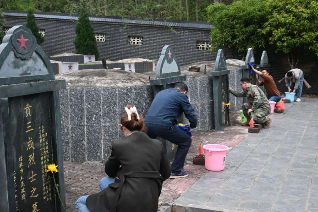 祭扫正式开始,在苍松翠柏的见证下,一场跨越时空的对话悄然展开,教师党员带领学生党员依次将鲜花敬献于墓前,并深情鞠躬;退役军人系统的工作人员手持干净的毛巾,教导其余代表小心翼翼地拂去烈士墓碑上的浮尘与落叶。