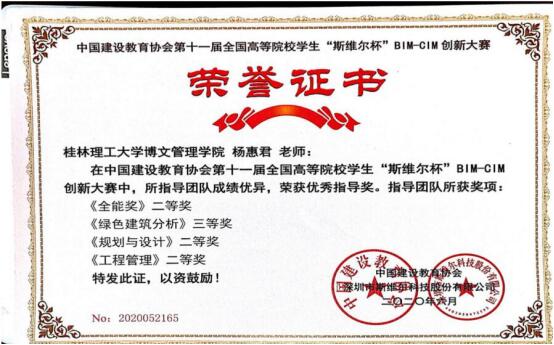 2020年指导学生参加第十一届全国高等院校学生“斯维尔杯”BIM-CIM创新大赛获得全能奖二等奖、规划设计项二等奖、工程管理项二等奖、绿色建筑分析项三等奖;